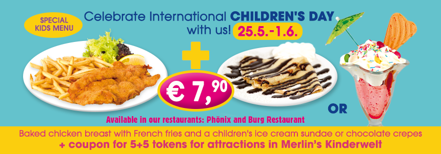 Baked chicken breast with French fries and a children's ice cream sundae or chocolate crepes + coupon for 5+5 tokens for attractions in Merlin’s Kinderwelt!